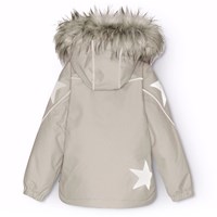 Grå vind- og vandtæt vinterjakke til en kold vinter i genanvendt polyester. Jakken har en aftagelig foret hætte med en aftagelig faux fur kant samt to lynlåse på fronten med hagebeskytter for at undgå huden kommer i klemme. Lynlåsene har indvendigt overfald, som bidrager til at holde sne, vind og vand ude. Jakken er udstyret med refleksbånd på ærmer, ryggen og hætten samt to stjerner reflekser på ærmerne, som sikrer synlighed i trafikken. Ærmerne er udstyret med en elestik kant der effektivt holder vind, sne og regn ude og samtidig sikrer, at vanterne forbliver på plads. Jakken er foret med fleece og 3M™ Thinsulate™, hvis lethed giver barnet en større bevægelighed uden at gå på kompromis med isoleringsevnen.