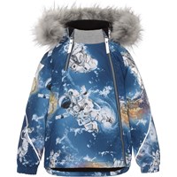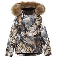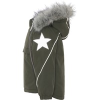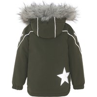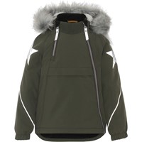 Hopla Fur er en funktionel og vandtæt vinterjakke i grøn. Hopla Fur er perfekt både til de ekstrem kolde og almindelige vintre, grundet dets utrolig høje åndbarhed samt isolering. Den høje åndbarhed er med til at hjælpe kropstemperaturen regulere sig og sørge for, at dit barn hverken bliver for kold eller varm. På varmere vinterdage kan barnet derfor nøjes med tynde lag under og på dage med voldsomme tocifrede minusgrader kan man supplere med et ekstra lag indenunder. Har du er stillesiddende barn vil Hopla Fur også være et oplagt valg.  Jakken har aftagelig hætte med faux fur pelskant (som også kan tages af), skrå lynlåse ned langs fronten, rib ved hals, elastik ved ærmeafslutninger samt Molo's velkendte refleksstjerne på begge overarme og nederst på jakken bagpå. Desuden har jakken højkvalitetsfleece på udsatte områder og tapede sømme. Ydermaterialet er fremstillet af 59% recycled nylon, 3M™ Thinsulate™ foret er fremstillet af 78% recycled polyester og inderstoffet af 100% recycled polyester. Dette produkt har en vandafvisende PFC-fri imprægnering (indeholder f.eks. ikke PFOS, PFOA og lignende). Vandsøjletrykket og åndbarheden er yderligere forbedret og er nu helt oppe på 15.000 mm i vandsøjletryk og åndbarhed på 15.000 g/m2/24t.