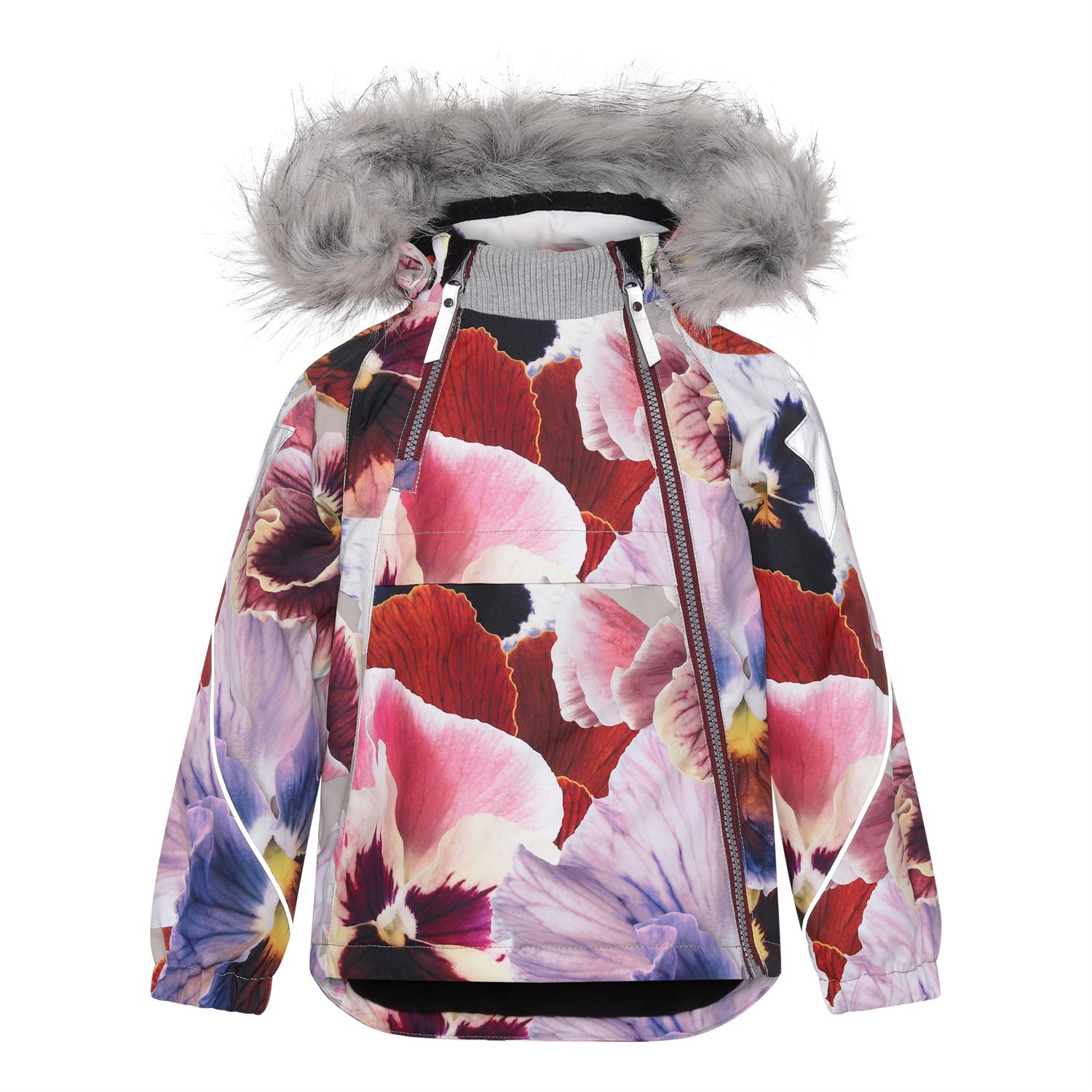 Hopla Fur er en funktionel og vandtæt vinterjakke med print af store blomster i varme farver. Jakkens for og inderstof er recycled og fremstillet af genamvendt polyester. Jakken har aftagelig hætte med faux fur pelskant (som også kan tages af), skrå lynlåse ned langs fronten, rib ved hals, elastik ved ærmeafslutninger samt Molo's velkendte refleksstjerne på begge overarme og nederst på jakken bagpå. Desuden har jakken højkvalitetsfleece på udsatte områder og tapede sømme. Dette produkt har en vandafvisende PFC-fri imprægnering (indeholder f.eks. ikke PFOS, PFOA og lignende). Vandsøjletrykket og åndbarheden er yderligere forbedret og er nu helt oppe på 15.000 mm i vandsøjletryk og åndbarhed på 15.000 g/m2/24t.