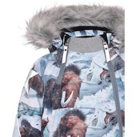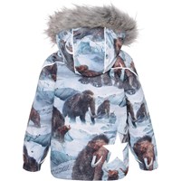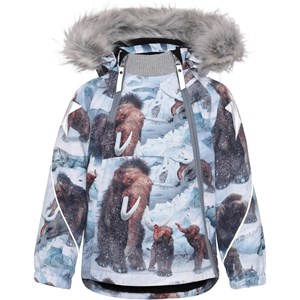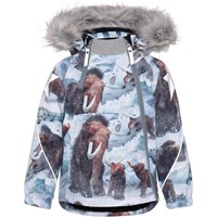 Hopla Fur er en funktionel og vandtæt vinterjakke i lyseblå med print af mammutter. Jakkens for og inderstof er recycled og fremstillet af genamvendt polyester. Jakken har aftagelig hætte med faux fur pelskant (som også kan tages af), skrå lynlåse ned langs fronten, rib ved hals, elastik ved ærmeafslutninger samt Molo's velkendte refleksstjerne på begge overarme og nederst på jakken bagpå. Desuden har jakken højkvalitetsfleece på udsatte områder og tapede sømme. Dette produkt har en vandafvisende PFC-fri imprægnering (indeholder f.eks. ikke PFOS, PFOA og lignende). Vandsøjletrykket og åndbarheden er yderligere forbedret og er nu helt oppe på 15.000 mm i vandsøjletryk og åndbarhed på 15.000 g/m2/24t.