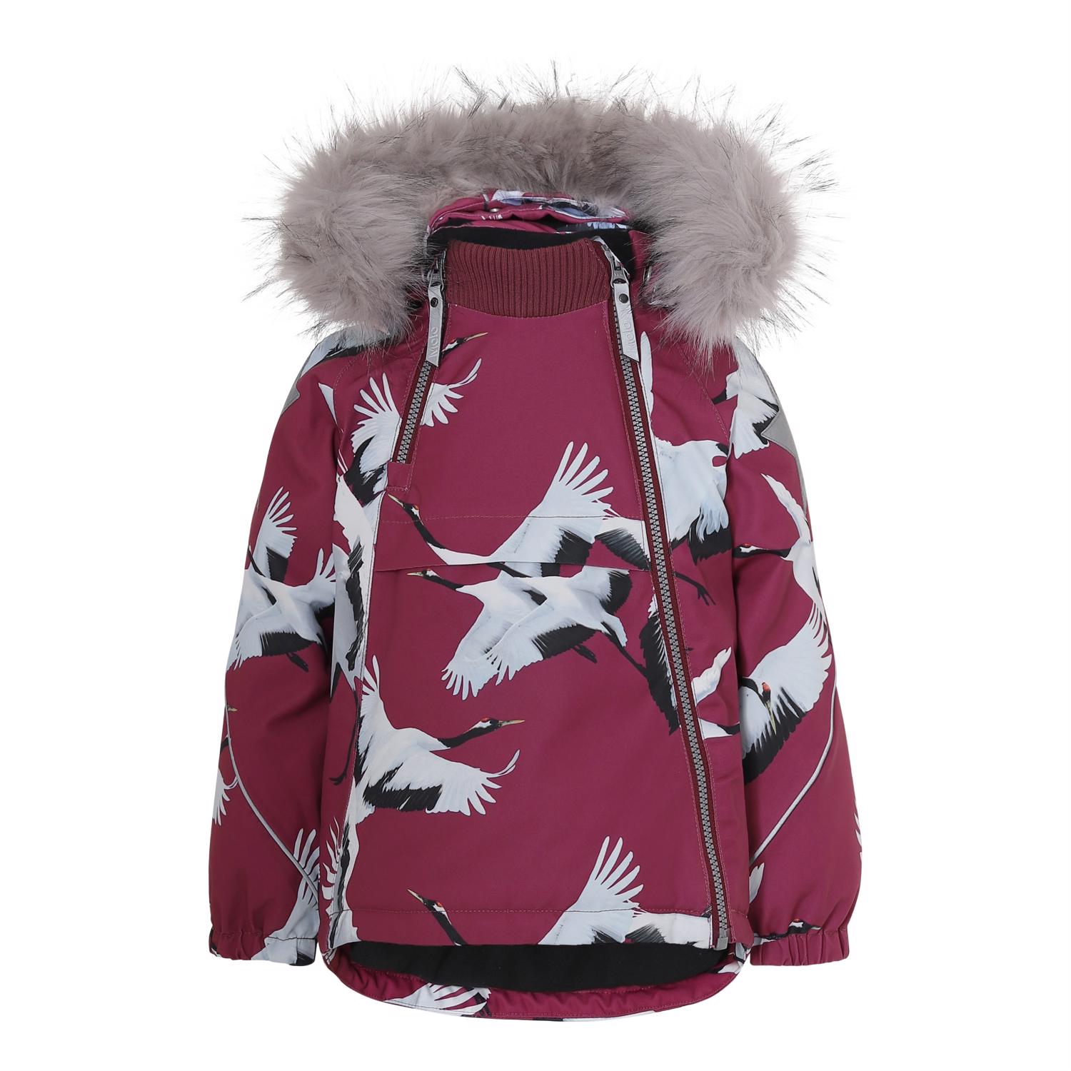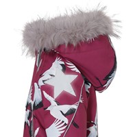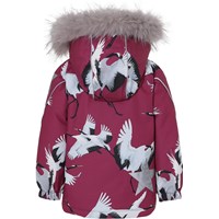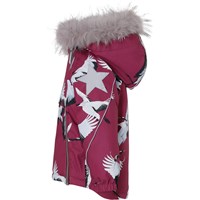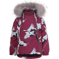 Hopla Fur er en funktionel og vandtæt vinterjakke i bordeaux med print af flyvende traner. Jakken har aftagelig hætte med faux fur pelskant (som også kan tages af), skrå lynlåse ned langs fronten, rib ved hals, elastik ved ærmeafslutninger samt Molo's velkendte refleksstjerne på begge overarme og nederst på jakken bagpå. Jakken er lavet i et vindtæt, vandtæt og åndbart materiale, har 3M™ Thinsulate™ isolering, højkvalitetsfleece på udsatte områder og tapede sømme. Dette produkt har en vandafvisende PFC-fri imprægnering (indeholder f.eks. ikke PFOS, PFOA og lignende). Vandsøjletrykket og åndbarheden er yderligere forbedret og er nu helt oppe på 15.000 mm i vandsøjletryk og åndbarhed på 15.000 g/m2/24t.