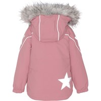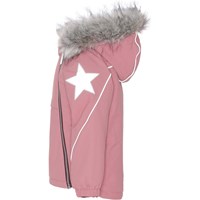 Hopla Fur er en funktionel og vandtæt vinterjakke i rosa. Hopla Fur er perfekt både til de ekstrem kolde og almindelige vintre, grundet dets utrolig høje åndbarhed samt isolering. Den høje åndbarhed er med til at hjælpe kropstemperaturen regulere sig og sørge for, at dit barn hverken bliver for kold eller varm. På varmere vinterdage kan barnet derfor nøjes med tynde lag under og på dage med voldsomme tocifrede minusgrader kan man supplere med et ekstra lag indenunder. Har du er stillesiddende barn vil Hopla Fur også være et oplagt valg.  Jakken har aftagelig hætte med faux fur pelskant (som også kan tages af), skrå lynlåse ned langs fronten, rib ved hals, elastik ved ærmeafslutninger samt Molo's velkendte refleksstjerne på begge overarme og nederst på jakken bagpå. Desuden har jakken højkvalitetsfleece på udsatte områder og tapede sømme. Ydermaterialet er fremstillet af 59% recycled nylon, 3M™ Thinsulate™ foret er fremstillet af 78% recycled polyester og inderstoffet af 100% recycled polyester. Dette produkt har en vandafvisende PFC-fri imprægnering (indeholder f.eks. ikke PFOS, PFOA og lignende). Vandsøjletrykket og åndbarheden er yderligere forbedret og er nu helt oppe på 15.000 mm i vandsøjletryk og åndbarhed på 15.000 g/m2/24t.