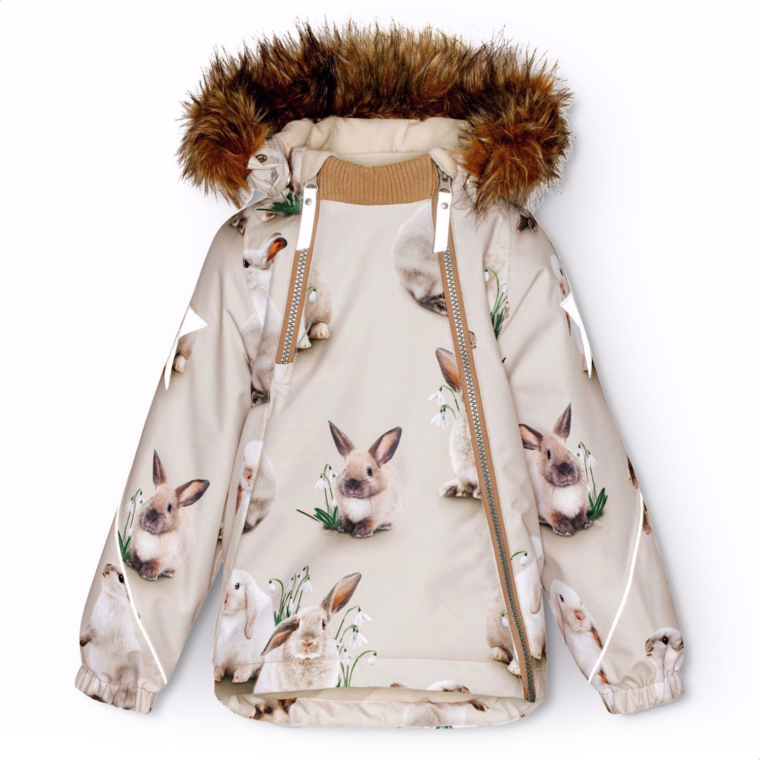 Vind- og vandtæt vinterjakke til en kold vinter i genanvendt polyester, med et print af nuttede kaniner imellem vintergækker på en grå bagrund. Jakken har en aftagelig foret hætte med en aftagelig faux fur kant samt to lynlåse på fronten med hagebeskytter for at undgå huden kommer i klemme. Lynlåsene har indvendigt overfald, som bidrager til at holde sne, vind og vand ude. Jakken er udstyret med refleksbånd på ærmer, ryggen og hætten samt to stjerner reflekser på ærmerne, som sikrer synlighed i trafikken. Ærmerne er udstyret med en elestik kant der effektivt holder vind, sne og regn ude og samtidig sikrer, at vanterne forbliver på plads. Jakken er foret med fleece og 3M™ Thinsulate™, hvis lethed giver barnet en større bevægelighed uden at gå på kompromis med isoleringsevnen.