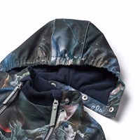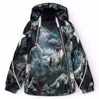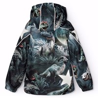 Vind- og vandtæt vinterjakke til en kold vinter i genanvendt polyester, med et print af dinosauer i rummet i blå, grønne og brune nuancer. Jakken har en aftagelig foret hætte, to lynlåse på fronten med hagebeskytter for at undgå huden kommer i klemme. Lynlåsene har indvendigt overfald, som bidrager til at holde sne, vind og vand ude. Jakken er udstyret med refleksbånd på ærmer, ryggen og hætten samt to stjerner reflekser på ærmerne, som sikrer synlighed i trafikken. Ærmerne er udstyret med en elastik kant der effektivt holder vind, sne og regn ude og samtidig sikrer, at vanterne forbliver på plads. Jakken er foret med fleece og 3M™ Thinsulate™, hvis lethed giver barnet en større bevægelighed uden at gå på kompromis med isoleringsevnen.