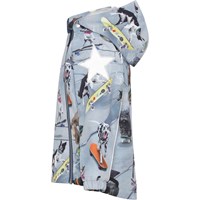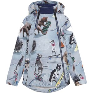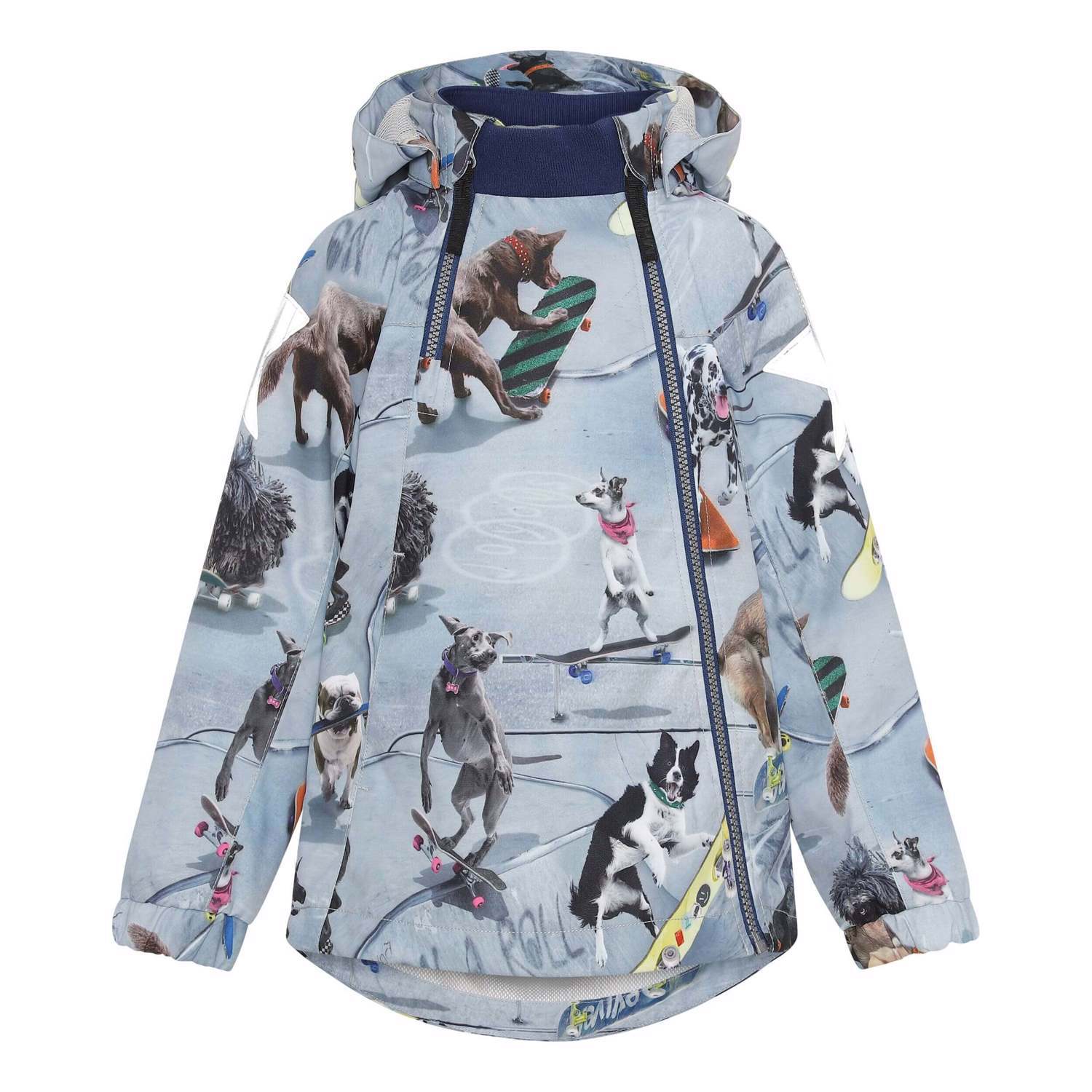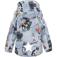 Hopla er en af Molo's klassikere med et anorak look, her i en let sommerudgave med et print af sjove hunde, der skater. Jakken er lavet i et ansvarligt materiale, eftersom den er fremstillet af 100% genanvendt polyester fra plastikflasker. Hopla har en aftagelig hætte, skrå lynlåse, samt justerbar bund og Molo's velkendte refleksstjerne på siden af begge ærmer og bagpå. Jakken passer til det meste vejr på grund af sin vandtæthed og gode åndbarhed. Sømmene er også tapede. Dette produkt har en vandafvisende PFC-fri imprægnering (indeholder f.eks. ikke PFOS, PFOA og lignende). Vandsøjletryk: 5.000 mm. Åndbarhed: 5.000 g/m2/24t.