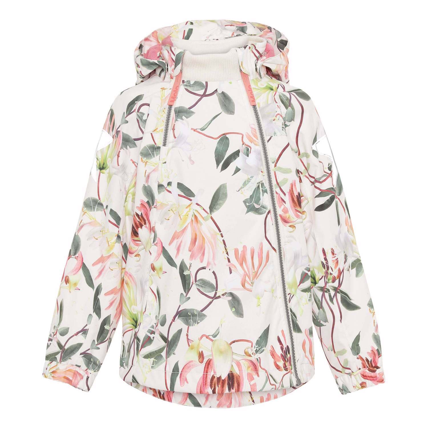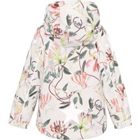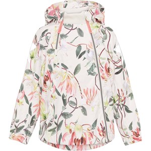 Hopla er en af Molo's klassikere med et anorak look, her i en let sommerudgave med et smukt blomsterprint. Jakken er lavet i et ansvarligt materiale, eftersom den er fremstillet af 100% genanvendt polyester fra plastikflasker. Hopla har en aftagelig hætte, skrå lynlåse, samt justerbar bund og Molo's velkendte refleksstjerne på siden af begge ærmer og bagpå. Jakken passer til det meste vejr på grund af sin vandtæthed og gode åndbarhed. Sømmene er også tapede. Dette produkt har en vandafvisende PFC-fri imprægnering (indeholder f.eks. ikke PFOS, PFOA og lignende). Vandsøjletryk: 5.000 mm. Åndbarhed: 5.000 g/m2/24t.