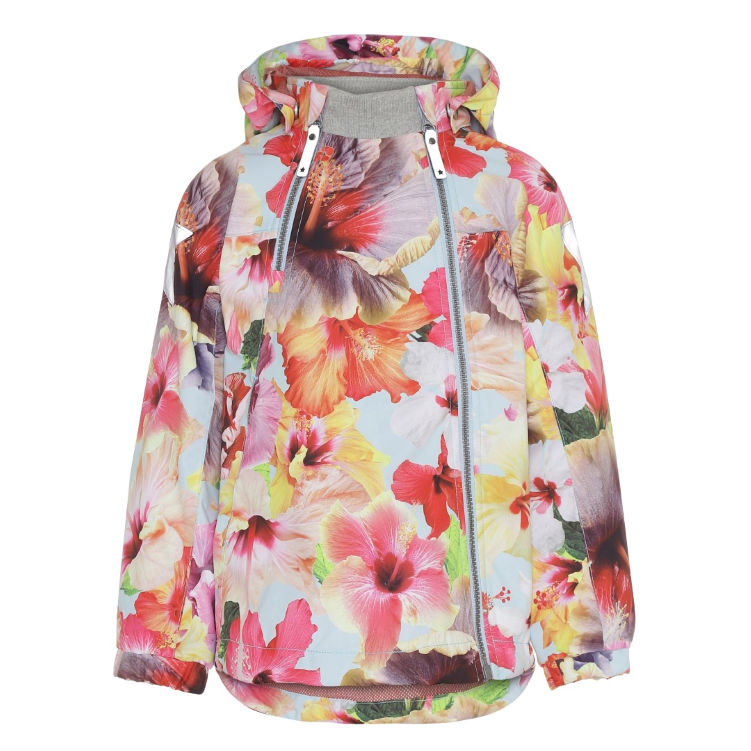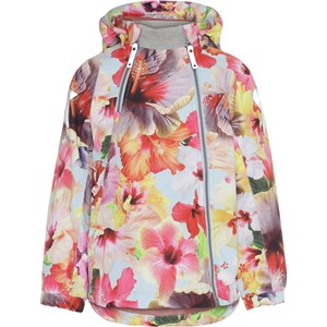 Hopla er en af Molo's klassikere, her i en let sommer udgave med farverigt blomster print. Hopla har en aftagelig hætte, skrå lynlåse, samt justerbar bund og Molo's velkendte refleksstjerne på siden af begge ærmer. Jakken passer til det meste vejr på grund af sin gode åndbarhed. Dette produkt har en vandafvisende PFC-fri imprægnering (indeholder f.eks. ikke PFOS, PFOA og lignende). Vandsøjletryk: 5.000 mm. Åndbarhed: 5.000 g/m2/24t