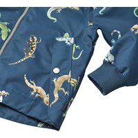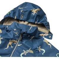 Mørkeblå jakke i genanvendt polyester, der beskytter mod vind og vand. Jakken har et farverigt print af gekkoer, aftagelig hætte, lommer, lynlås med hagebeskytter og bred ribkant ved håndleddene. Taljen kan justeres indvendigt for en god pasform.