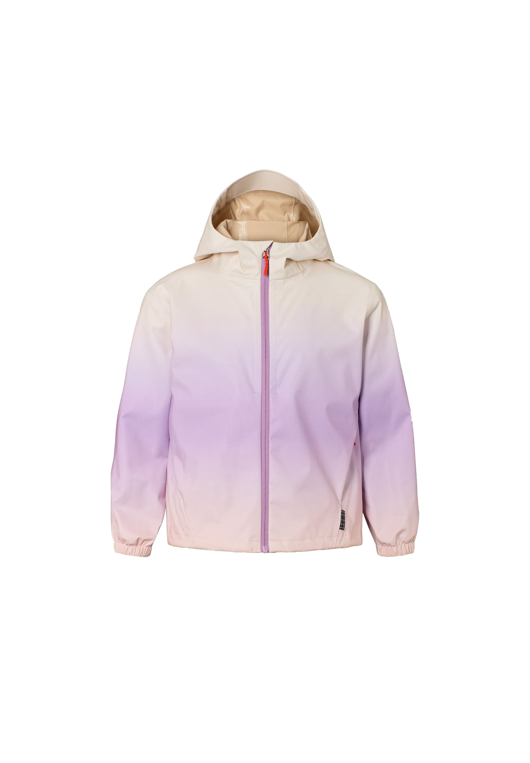 Let og vandtæt jakke i genanvendt polyester med smuk farvegradient fra creme til lavendel. Jakken har praktiske lynlåslommer, elastiske manchetter og justerbar snøre forneden. Perfekt til overgangssæsonen.