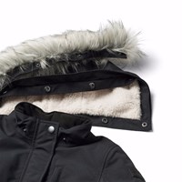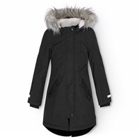Sort vind- og vandtæt vinterjakke til en kold vinter i genanvendt nylon. Jakken er knælang, med en elastik i ryggen der giver en figursyet facon, en aftagelig foret hætte med aftagelig faux fur kant, lynlås med overfald, der holder sne, vind og vand ude. Jakken er udstyret med flere store reflekser, som sikrer synlighed i trafikken. Jakken har foret lommer med lommeklap, en lynlås brystlomme samt en inderlomme. Ærmerne er udstyret med ribkanter, der effektivt holder vind, sne og regn ude og samtidig sikrer, at vanterne forbliver på plads. Jakken er foret med fleece og 3M™ Thinsulate™, hvis lethed giver barnet en større bevægelighed.