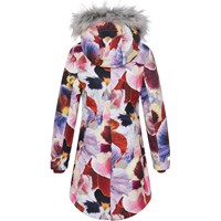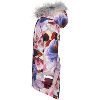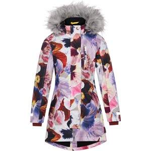 Peace er en funktionel og vandtæt parka vinterjakke med print af store blomster i varme farver. Jakken har aftagelig hætte med faux fur pelskant (som også kan tages af) og refleks, skjult lynlås med overfald, ærmegab med vindfang, tre frontlommer og elastik i ryggen for et mere fittet pasform. Jakken er lavet i et vindtæt, vandtæt og åndbart materiale med tapede sømme. Jakken er lavet i et vindtæt, vandtæt og åndbart materiale med tapede sømme, mens foret og inderstoffet er recycled og fremstillet af genanvendt polyester. Dette produkt har en vandafvisende PFC-fri imprægnering (indeholder f.eks. ikke PFOS, PFOA og lignende). Vandsøjletrykket og åndbarheden er yderligere forbedret og er nu helt oppe på 15.000 mm i vandsøjletryk og åndbarhed på 15.000 g/m2/24t.