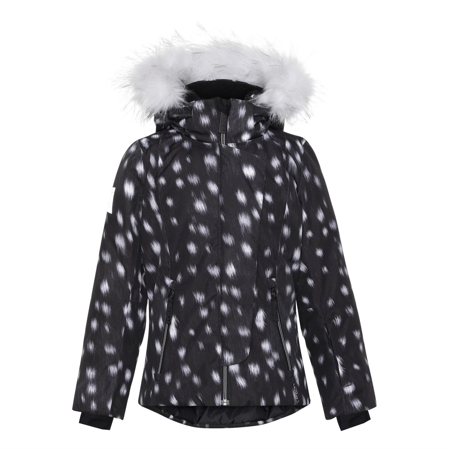 Pearson er en funktionel of vandtæt skijakke i sort med hvide pletter og hvid faux fur pelskrave. Pearson har en aftagelig hætte, lynlås ned langs fronten med asymmetrisk overfald, lommer i siden, samt justerbart ærmegab med tætsluttende vindfang med hul til tommelfinger og refleksstriber på ærmerne. Jakken er lavet i et vindtæt, vandtæt og åndbart materiale med tapede sømme, mens foret og inderstoffet er recycled og fremstillet af genanvendt polyester. Dette produkt har en vandafvisende PFC-fri imprægnering (indeholder f.eks. ikke PFOS, PFOA og lignende). Vandsøjletryk: 15.000 mm. Åndbarhed: 15.000 g/m2/24t.