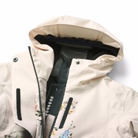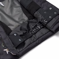 Vind- og vandtæt vinterjakke i genanvendt polyester med et print af farverige blomster som matcher den lyse og mørke gradient farvet baggrund. Jakken har en foret hætte, praktisk lynlås med overfald, samt vandtætte lynlåslommer. Der er en lomme på ærmet til skikort og en indvendig lomme til ekstra opbevaring. Jakken har vindfang ved hoften velcro om håndledet samt ærmeåbninger med tommelfingerhul, som effektivt holder sne, vind og vand ude. Ydermere er jakken foret med fleece, vatteret med 3M™ Thinsulate™, samt en tekst refleks for synlighed i trafikken.