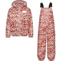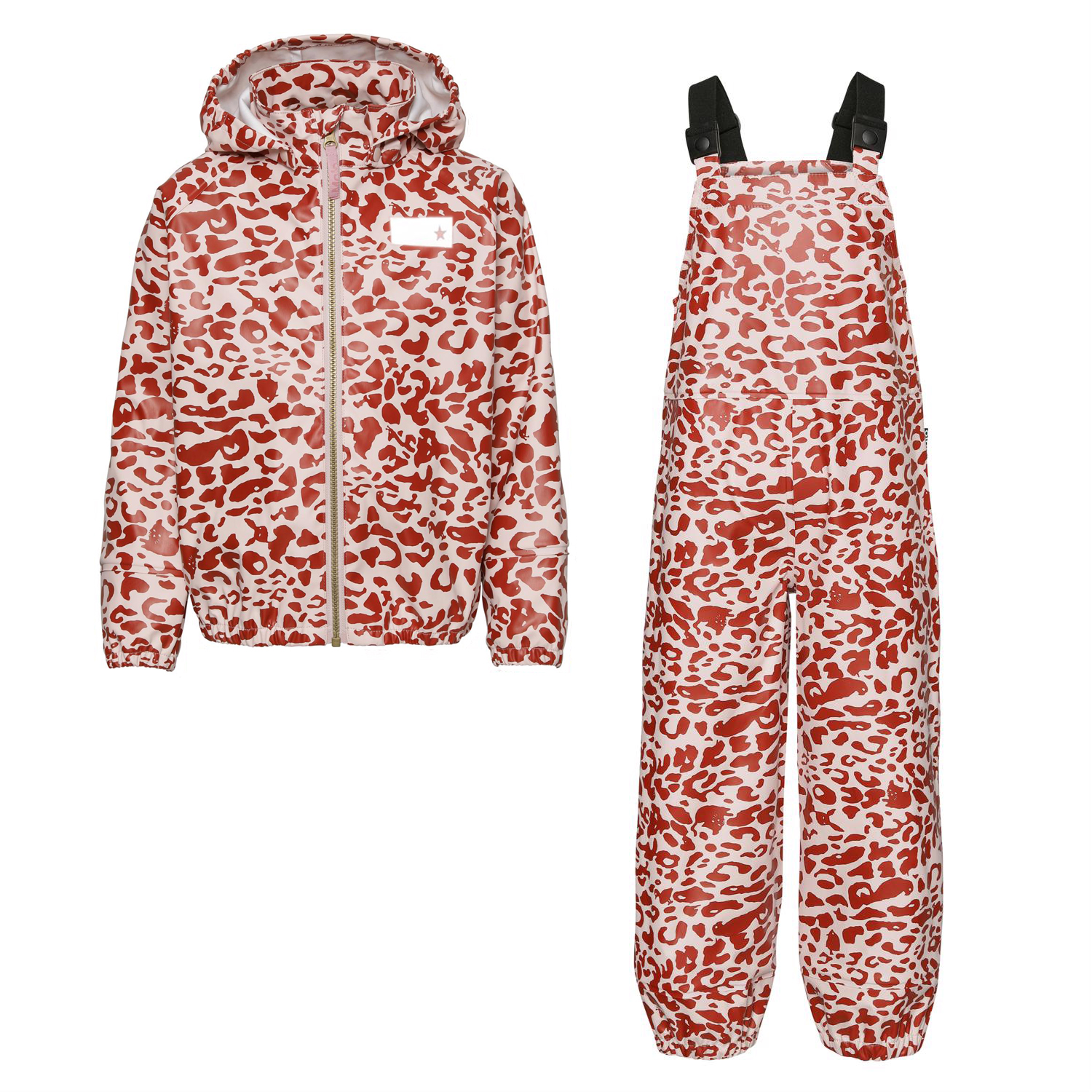 Wade er et regntøjssæt, som består af en regnjakke og et par regnoveralls i rødt og rosa leopard print. Regnjakken har aftagelig hætte og lynlåslukning på fronten. Regnbukserne har justerbare seler og elastisk benafslutning. Både regnjakken og bukserne har Molo's velkendte refleks stjerne på bagsiden. Dette produkt har en vandafvisende PFC-fri imprægnering (indeholder f.eks. ikke PFOS, PFOA og lignende). Vandsøjletryk: 8.000 mm.