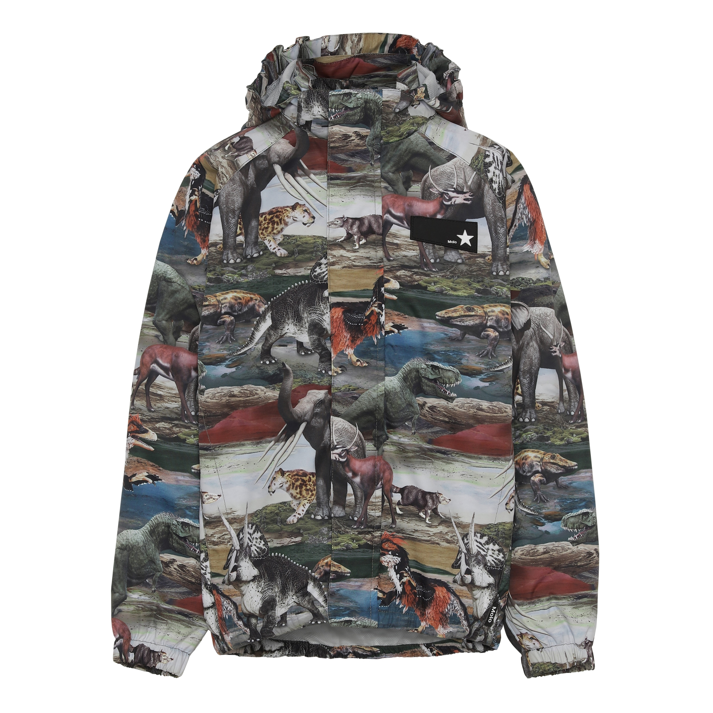 Waiton er en let og funktionel regnjakke med print af fortidens dyr i flotte jordfarver. Waiton har tildækket lynlås, som beskytter mod vind og regn, tapede sømme, aftagelig hætte og to front lommer. Jakken har Molo's ikoniske stjerne refleks på bagsiden, som giver ekstra synlighed i mørket. Dette produkt har en vandafvisende PFC-fri imprægnering (indeholder f.eks. ikke PFOS, PFOA og lignende). Vandsøjletryk: 5.000 mm. Åndbarhed: 5.000 g/m2/24t.