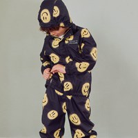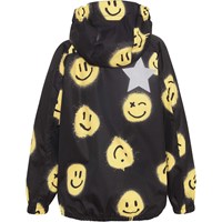 Waiton er en let og funktionel regnjakke med nylonfor i sort med et smiley print. Waiton har tildækket lynlås, som beskytter mod vind og regn, tapede sømme, aftagelig hætte og to frontlommer. Jakken har Molo's ikoniske stjerne refleks på bagsiden, som giver ekstra synlighed i mørket. En stor fordel ved dette regntøjsprodukt er også, at det er åndbart, så høj aktivitet ikke resulterer i en fugtig inderside. Dette produkt har en vandafvisende PFC-fri imprægnering (indeholder f.eks. ikke PFOS, PFOA og lignende). Vandsøjletryk: 5.000 mm. Åndbarhed: 5.000 g/m2/24t