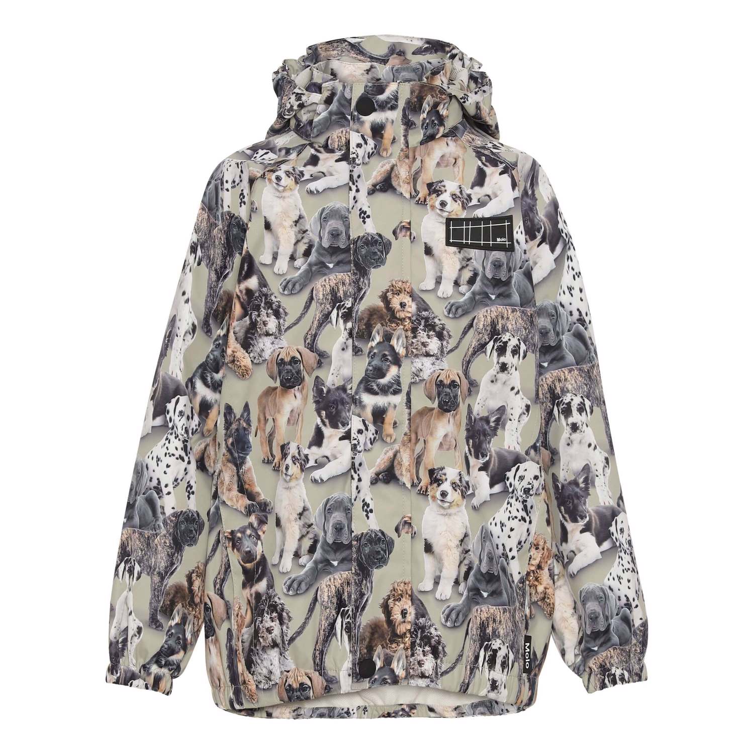 Waiton er en let og funktionel regnjakke med nylonfor i khaki med et charmerende hundeprint. Waiton har tildækket lynlås, som beskytter mod vind og regn, tapede sømme, aftagelig hætte og to frontlommer. Jakken har Molo's ikoniske stjerne refleks på bagsiden, som giver ekstra synlighed i mørket. En stor fordel ved dette regntøjsprodukt er også, at det er åndbart, så høj aktivitet ikke resulterer i en fugtig inderside. Dette produkt har en vandafvisende PFC-fri imprægnering (indeholder f.eks. ikke PFOS, PFOA og lignende). Vandsøjletryk: 5.000 mm. Åndbarhed: 5.000 g/m2/24t