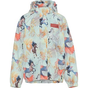 Waiton er en let og funktionel regnjakke i lyseblå med print af søheste. Waiton har tildækket lynlås, som beskytter mod vind og regn, tapede sømme, aftagelig hætte og to front lommer. Jakken har Molo's ikoniske stjerne refleks på bagsiden, som giver ekstra synlighed i mørket. Dette produkt har en vandafvisende PFC-fri imprægnering (indeholder f.eks. ikke PFOS, PFOA og lignende). Vandsøjletryk: 5.000 mm. Åndbarhed: 5.000 g/m2/24t.