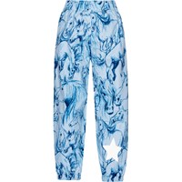 Lyseblå regnbukser med mørkeblåt alloverprint, baseret på håndtegnede skitser af heste. Bukserne er lavet i et let og åndbart materiale, der forhindrer kondens og fugt i at samle sig på indersiden, selv under høj aktivitet. Regnbukserne har justerbar elastik i taljen. På det ene bukseben er der en stor stjerneformet refleks for ekstra synlighed i trafikken. Alle sømme er tapede for at forhindre vandindtrængning. Vandsøjletryk: 5.000 mm. Åndbarhed: 5.000 g/m²/24t.