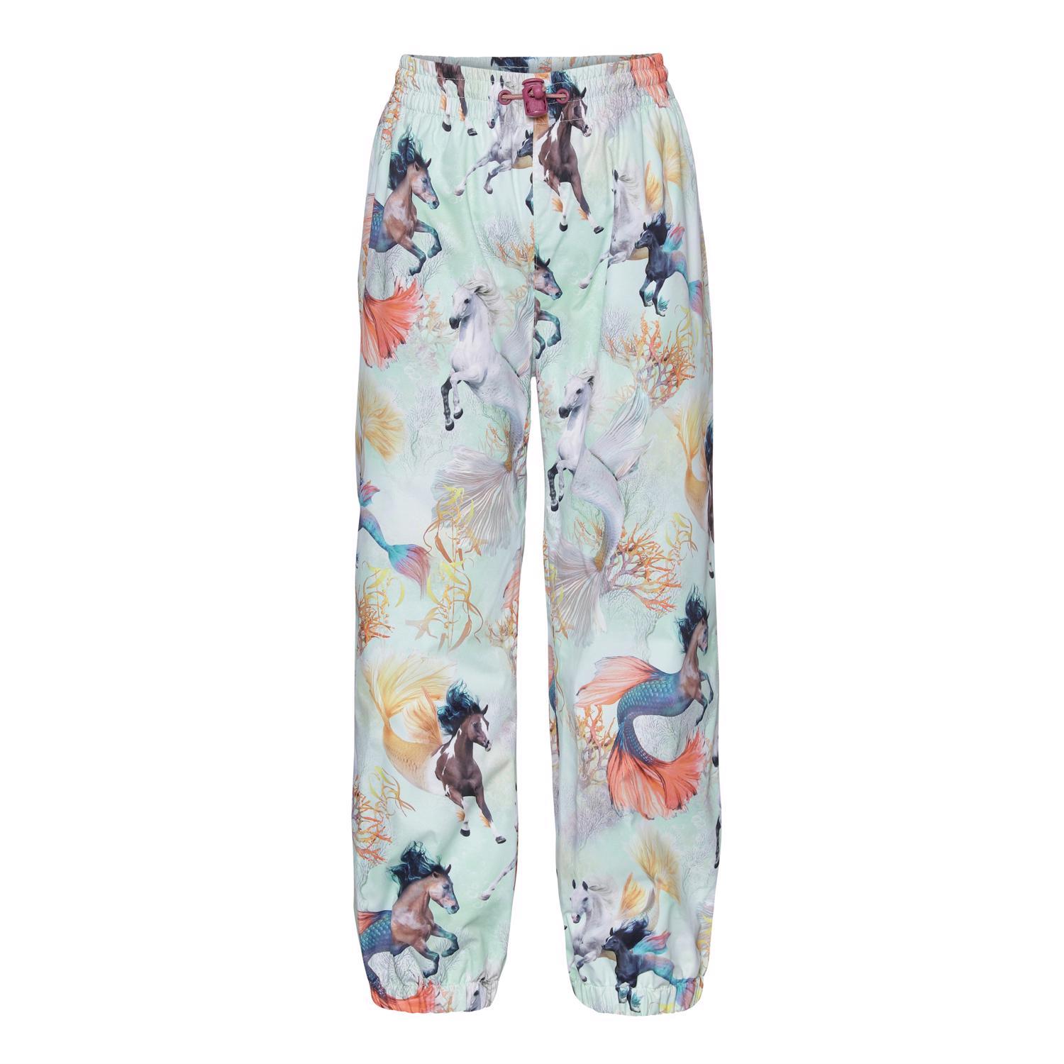 Waits er et par lette og funktionelle regnbukser i lyseblå med print af søheste. Regnbukserne har elastik i benåbningen og Molo's ikoniske refleks stjerne på det ene ben. Regnbukserne kan blive brugt i alt slags vejr, da materialet er vandafvisende og åndbart, samt har tapede sømme. Dette produkt har en vandafvisende PFC-fri imprægnering (indeholder f.eks. ikke PFOS, PFOA og lignende). Vandsøjletryk: 5.000 mm. Åndbarhed: 5.000 g/m2/24t