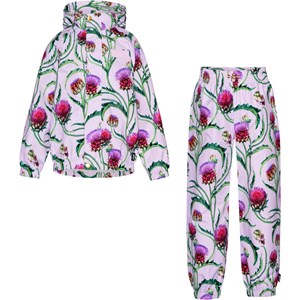 Lyserødt regnsæt med alloverprint af udsprungne artiskok blomster. Sættet er lavet i et let og åndbart materiale, der forhindrer at der samles kondens og fugt på indersiden, selv under høj aktivitet. Jakken har aftagelig hætte, to frontlommer, elastik i ærmegab og bunden samt en tildækket lynlås, der beskytter mod vind og regn. Bukserne har justerbar elastik i taljen og ved benåbningen. På bagsiden har både bukser og jakke en stor stjernerefleks, der øger synligheden i trafikken. Samtlige sømme er tapede for at forhindre vandindtrængning. Vandsøjletryk: 5.000 mm. Åndbarhed: 5.000 g/m2/24t.