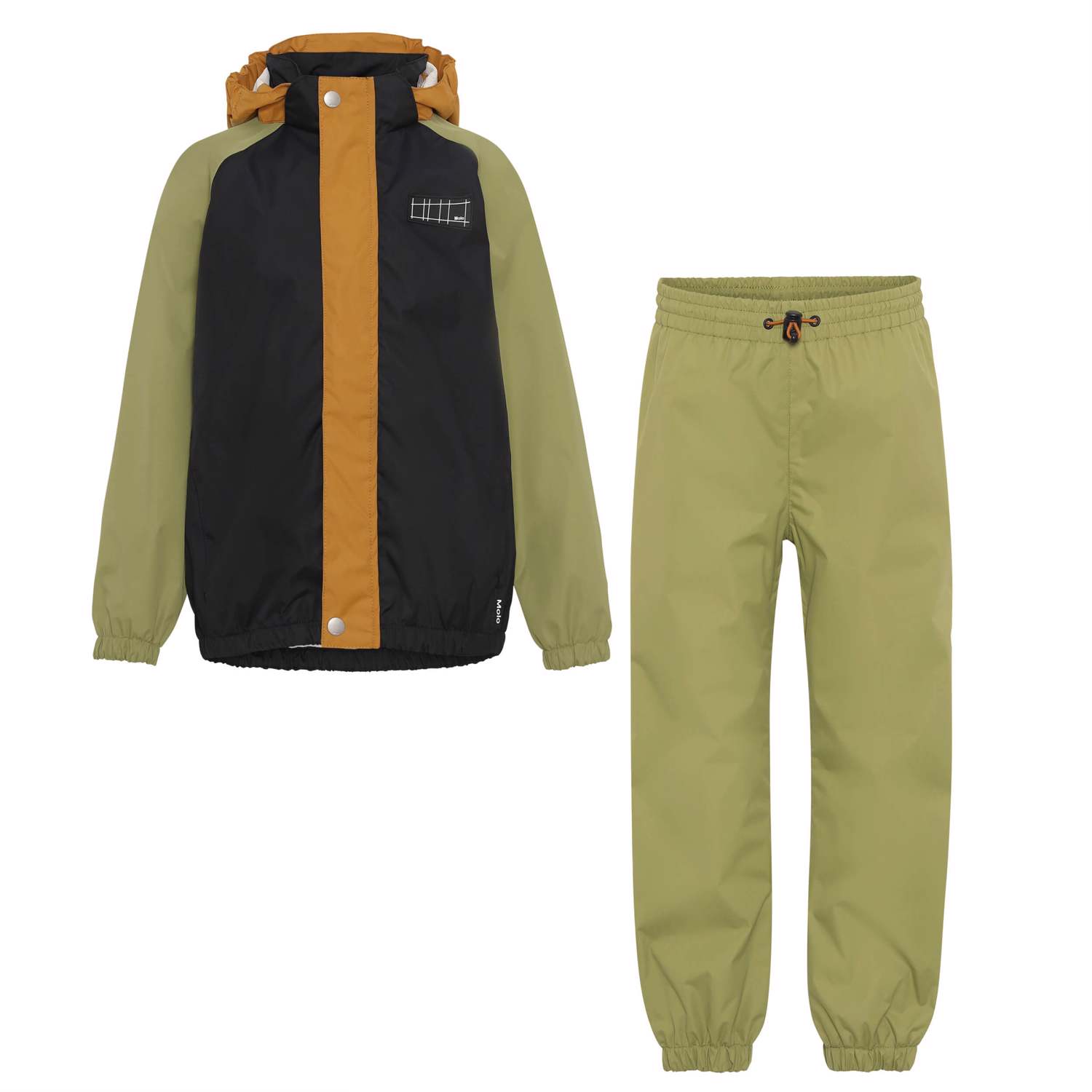 Whalley er et let og funktionelt regntøjssæt med jakke i et mix af 3 farver kombineret med bukser i cedergrøn. Regnjakken har tildækket lynlås, som beskytter mod vind og regn, tapede sømme, aftagelig hætte og to frontlommer. Regnbukserne har tapede sømme, elastik i benåbningen og i taljen, som kan reguleres. Både regnjakken og bukserne har Molo's velkendte refleksstjerne på bagsiden. En stor fordel ved dette regntøjsprodukt er også, at det er åndbart, så høj aktivitet ikke resulterer i en fugtig inderside. Regnsættet har en vandafvisende PFC-fri imprægnering (indeholder f.eks. ikke PFOS, PFOA og lignende). Vandsøjletryk: 5.000 mm. Åndbarhed: 5.000 g/m2/24.