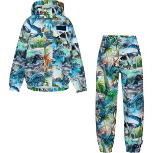 Grønt og blåt regnsæt med alloverprint af forskellige dinosaurer i blå og grønne nuancer. Sættet er lavet i et let og åndbart materiale, der forhindrer at der samles kondens og fugt på indersiden, selv under høj aktivitet. Jakken har aftagelig hætte, to frontlommer, elastik i ærmegab og bunden samt en tildækket lynlås, der beskytter mod vind og regn. Bukserne har justerbar elastik i taljen og ved benåbningen. På bagsiden har både bukser og jakke en stor stjernerefleks, der øger synligheden i trafikken. Samtlige sømme er tapede for at forhindre vandindtrængning. Vandsøjletryk: 5.000 mm. Åndbarhed: 5.000 g/m2/24t.