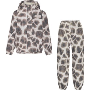 Whalley er et let og funktionelt regntøjssæt med giraf print. Regnjakken har tildækket lynlås, som beskytter mod vind og regn, tapede sømme, aftagelig hætte og to frontlommer. Regnbukserne har tapede sømme, elastik i benåbningen og i taljen, som kan reguleres. Både regnjakken og bukserne har Molo`s velkendte refleksstjerne på bagsiden. En stor fordel ved dette regntøjsprodukt er også, at det er åndbart, så høj aktivitet ikke resulterer i en fugtig inderside. Regnsættet har en vandafvisende PFC-fri imprægnering (indeholder f.eks. ikke PFOS, PFOA og lignende). Vandsøjletryk: 5.000 mm. Åndbarhed: 5.000 g/m2/24.