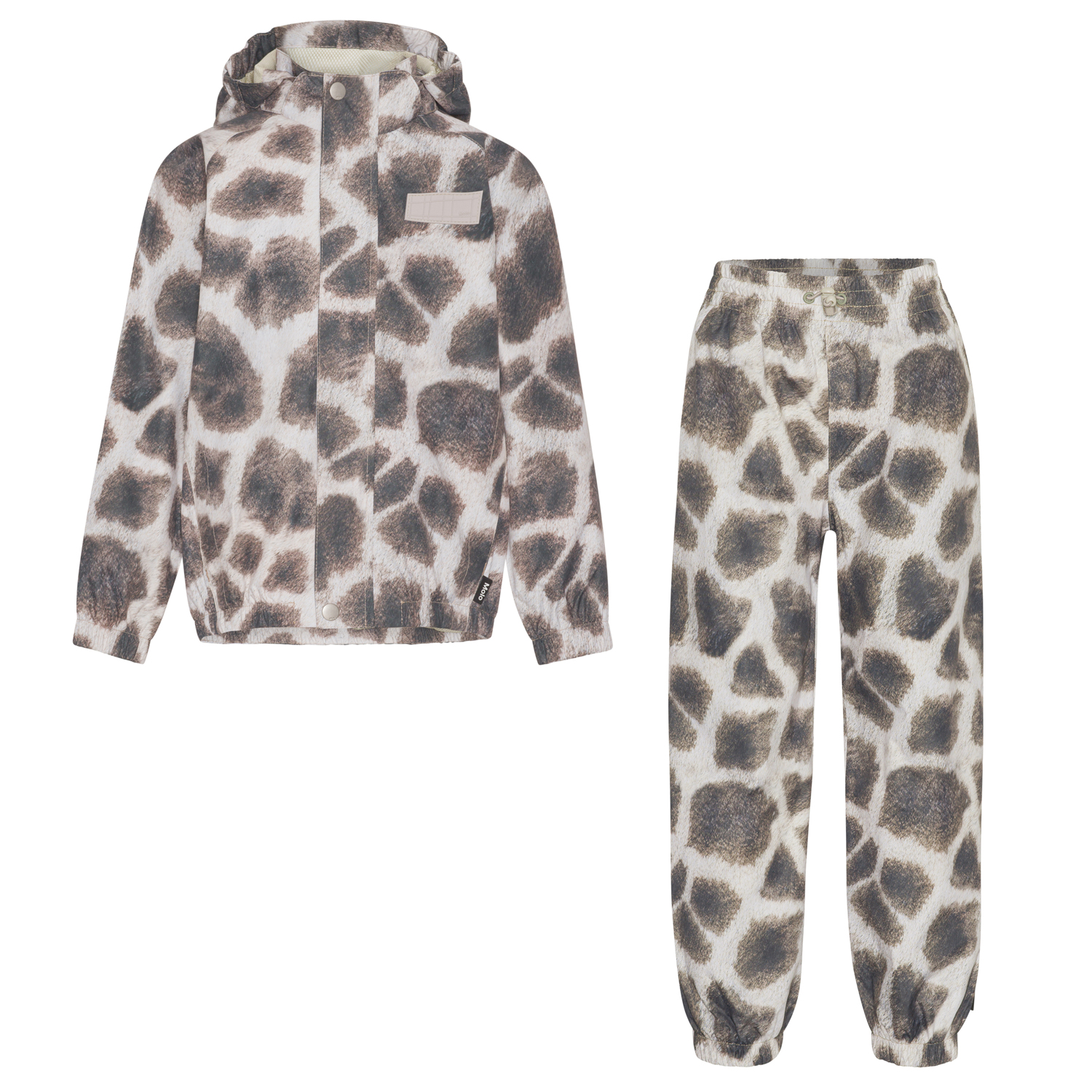 Whalley er et let og funktionelt regntøjssæt med giraf print. Regnjakken har tildækket lynlås, som beskytter mod vind og regn, tapede sømme, aftagelig hætte og to frontlommer. Regnbukserne har tapede sømme, elastik i benåbningen og i taljen, som kan reguleres. Både regnjakken og bukserne har Molo`s velkendte refleksstjerne på bagsiden. En stor fordel ved dette regntøjsprodukt er også, at det er åndbart, så høj aktivitet ikke resulterer i en fugtig inderside. Regnsættet har en vandafvisende PFC-fri imprægnering (indeholder f.eks. ikke PFOS, PFOA og lignende). Vandsøjletryk: 5.000 mm. Åndbarhed: 5.000 g/m2/24.