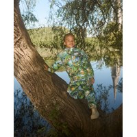 Grønt vind- og vandtæt regnsæt i genanvendt polyester med et allover print af en jungle og dens farverige dyr. Jakken har en almindelig pasform, aftagelig hætte, lommer i siden, elastikkant i ærmer og i bunden. Bukserne har en almindelig pasform, en justerbar elastik i taljen, aftagelige og justerbar gummistrop med Molos logo samt en refleks nederst på benet. Hele sættet har vandtætte sømme, som holder vejr og vind ude.