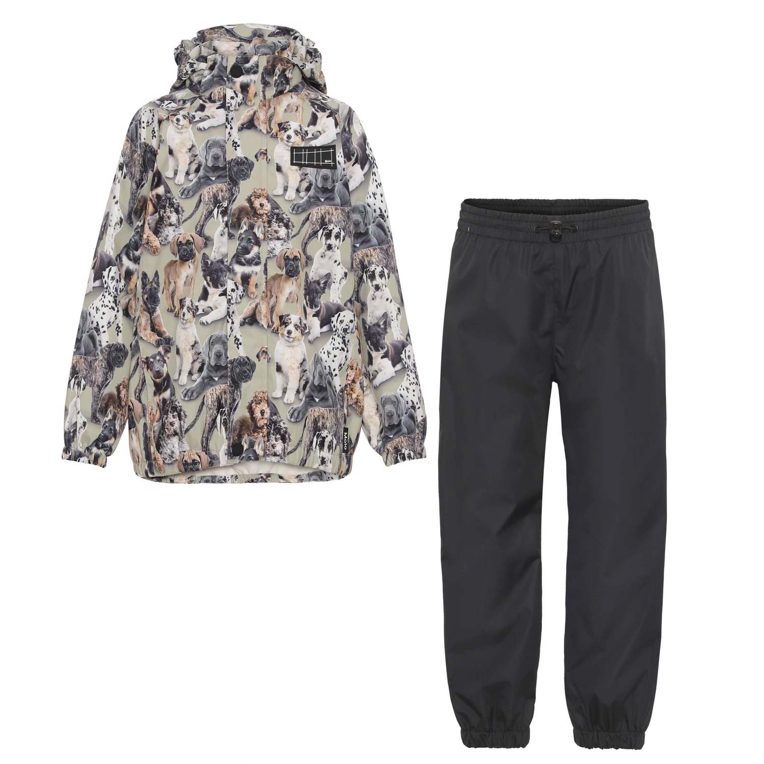 Whalley er et let og funktionelt regntøjssæt med jakke i khaki med hundeprint kombineret med sorte bukser. Regnjakken har tildækket lynlås, som beskytter mod vind og regn, tapede sømme, aftagelig hætte og to frontlommer. Regnbukserne har tapede sømme, elastik i benåbningen og i taljen, som kan reguleres. Både regnjakken og bukserne har Molo's velkendte refleksstjerne på bagsiden. En stor fordel ved dette regntøjsprodukt er også, at det er åndbart, så høj aktivitet ikke resulterer i en fugtig inderside. Regnsættet har en vandafvisende PFC-fri imprægnering (indeholder f.eks. ikke PFOS, PFOA og lignende). Vandsøjletryk: 5.000 mm. Åndbarhed: 5.000 g/m2/24.
