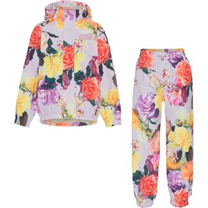 Whalley er et let og funktionelt regntøjssæt i lyselilla med print af store blomster. Regnjakken har tildækket lynlås, som beskytter mod vind og regn, tapede sømme, aftagelig hætte og to frontlommer. Regnbukserne har tapede sømme, elastik i benåbningen og i taljen, som kan reguleres. Både regnjakken og bukserne har Molo`s velkendte refleksstjerne på bagsiden. En stor fordel ved dette regntøjsprodukt er også, at det er åndbart, så høj aktivitet ikke resulterer i en fugtig inderside. Regnsættet har en vandafvisende PFC-fri imprægnering (indeholder f.eks. ikke PFOS, PFOA og lignende). Vandsøjletryk: 5.000 mm. Åndbarhed: 5.000 g/m2/24.