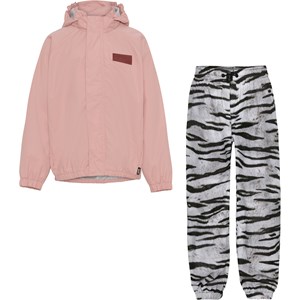 Whalley er et let og funktionelt regntøjssæt med tiger stribede bukser og en rosa jakke. Regnjakken har tildækket lynlås, som beskytter mod vind og regn, tapede sømme, aftagelig hætte og to frontlommer. Regnbukserne har elastisk talje og benafslutning. Både regnjakken og bukserne har Molo's velkendte refleks stjerne på bagsiden. Regnsættet har en vandafvisende PFC-fri imprægnering (indeholder f.eks. ikke PFOS, PFOA og lignende). Vandsøjletryk: 5.000 mm. Åndbarhed: 5.000 g/m2/24t