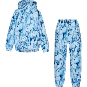 Lyseblåt regnsæt med mørkeblåt alloverprint, baseret på håndtegnede skitser af heste. Sættet er lavet i et let og åndbart materiale, der forhindrer at der samles kondens og fugt på indersiden, selv under høj aktivitet. Jakken har aftagelig hætte, to frontlommer, elastik i ærmegab og bunden samt en tildækket lynlås, der beskytter mod vind og regn. Bukserne har justerbar elastik i taljen og ved benåbningen. På bagsiden har både bukser og jakke en stor stjernerefleks, der øger synligheden i trafikken. Samtlige sømme er tapede for at forhindre vandindtrængning. Vandsøjletryk: 5.000 mm. Åndbarhed: 5.000 g/m2/24t.
