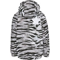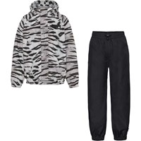 Whalley er et let og funktionelt regntøjssæt med sorte bukser og en tiger stribet jakke i sort og hvid. Regnjakken har tildækket lynlås, som beskytter mod vind og regn, tapede sømme, aftagelig hætte og to frontlommer. Regnbukserne har elastisk talje og benafslutning. Både regnjakken og bukserne har Molo's velkendte refleks stjerne på bagsiden. Regnsættet har en vandafvisende PFC-fri imprægnering (indeholder f.eks. ikke PFOS, PFOA og lignende). Vandsøjletryk: 5.000 mm. Åndbarhed: 5.000 g/m2/24t