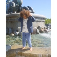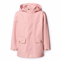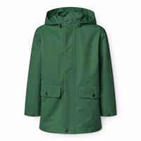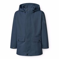 Mørkeblå vind- og vandtæt jakke i genanvendt polyester med aftagelig hætte. Jakken har en almindelig pasform, frontlommer med knaplukning, justerbare trykknapper ved håndleddene, vandtætte sømme og lynlås med overfald, som holder vejr og vind ude. Foret er i blødt bomuld med et allover print af smilende ansigter. Jakkens tekniske egenskaber gør den velegnet som regnjakke.
