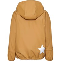 Zan er en honningfarvet regnjakke. Zan har aftagelig hætte og stjerne refleks på bagsiden, som giver ekstra synlighed i mørket. Dette produkt har en vandafvisende PFC-fri imprægnering (indeholder f.eks. ikke PFOS, PFOA og lignende). Vandsøjletryk: 8.000 mm. Dette Molo produkt er delvist recycled, da det er fremstillet af 50% genanvendeligt polyester. Det genanvendelige polyester er produceret af brugte plastikflasker og andet restaffald. Produktionen af genanvendt polyester kræver langt færre ressourcer og udleder mindre CO2, hvorfor Molo’s regntøj er det bæredygtige valg.
