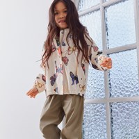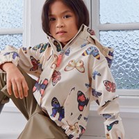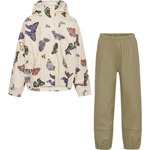 Zet er et regntøjssæt, hvor jakken er med sommerfugle print og bukserne i khaki. Regntøjssættet er lavet i en blød og klassisk gummikvalitet, som er ekstra interessant, fordi indersiden er lavet med en flot kontrastfarve. Regnjakken har aftagelig hætte, 2 frontlommer, refleks på bagsiden og det ene ærme, som giver ekstra synlighed i mørket. Regnbukserne har elastik i taljen og ved benafslutning, justerbar fodstrop og refleks på bagsiden af det ene ben. Indvendigt fortsætter gummikvaliteten et lille stykke op i benet, derved undgår man, at regnvand trænger op ad benet. En ekstra detalje for at holde dit barn tørt. Dette produkt har en vandafvisende PFC-fri imprægnering (indeholder f.eks. ikke PFOS, PFOA og lignende). Vandsøjletryk: 8.000 mm.