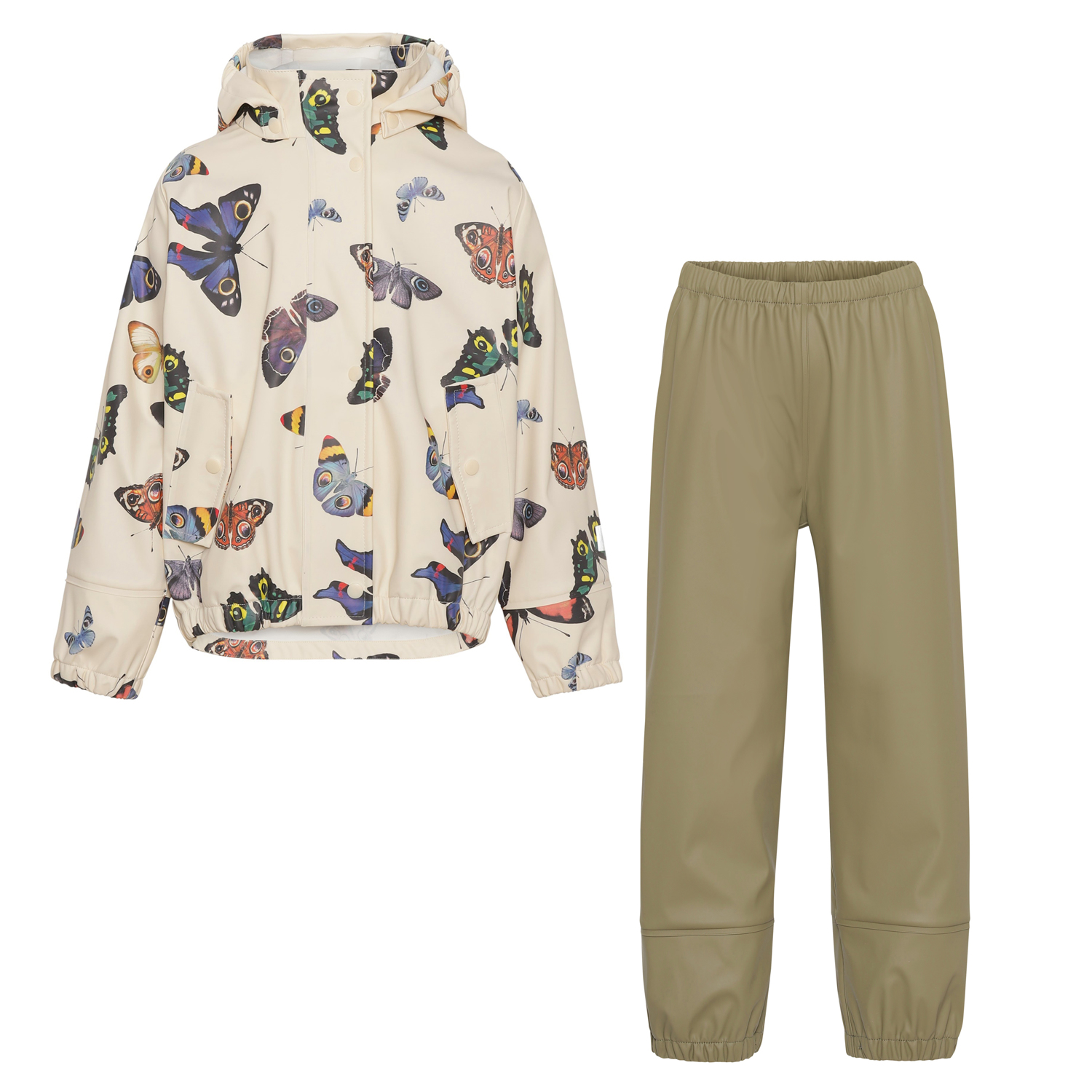 Zet er et regntøjssæt, hvor jakken er med sommerfugle print og bukserne i khaki. Regntøjssættet er lavet i en blød og klassisk gummikvalitet, som er ekstra interessant, fordi indersiden er lavet med en flot kontrastfarve. Regnjakken har aftagelig hætte, 2 frontlommer, refleks på bagsiden og det ene ærme, som giver ekstra synlighed i mørket. Regnbukserne har elastik i taljen og ved benafslutning, justerbar fodstrop og refleks på bagsiden af det ene ben. Indvendigt fortsætter gummikvaliteten et lille stykke op i benet, derved undgår man, at regnvand trænger op ad benet. En ekstra detalje for at holde dit barn tørt. Dette produkt har en vandafvisende PFC-fri imprægnering (indeholder f.eks. ikke PFOS, PFOA og lignende). Vandsøjletryk: 8.000 mm.