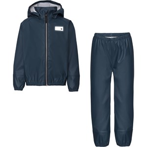 Zet er et mørkeblåt regntøjssæt. Regnjakken har aftagelig hætte og lynlåslukning på fronten. Regnbukserne har elastisk talje og benafslutning. Både regnjakken og bukserne har Molo's velkendte refleks stjerne på bagsiden. Dette produkt har en vandafvisende PFC-fri imprægnering (indeholder f.eks. ikke PFOS, PFOA og lignende). Vandsøjletryk: 8.000 mm. Dette Molo produkt er delvist recycled, da det er fremstillet af 50% genanvendeligt polyester. Det genanvendelige polyester er produceret af brugte plastikflasker og andet restaffald. Produktionen af genanvendt polyester kræver langt færre ressourcer og udleder mindre CO2, hvorfor Molo’s regntøj er det bæredygtige valg.