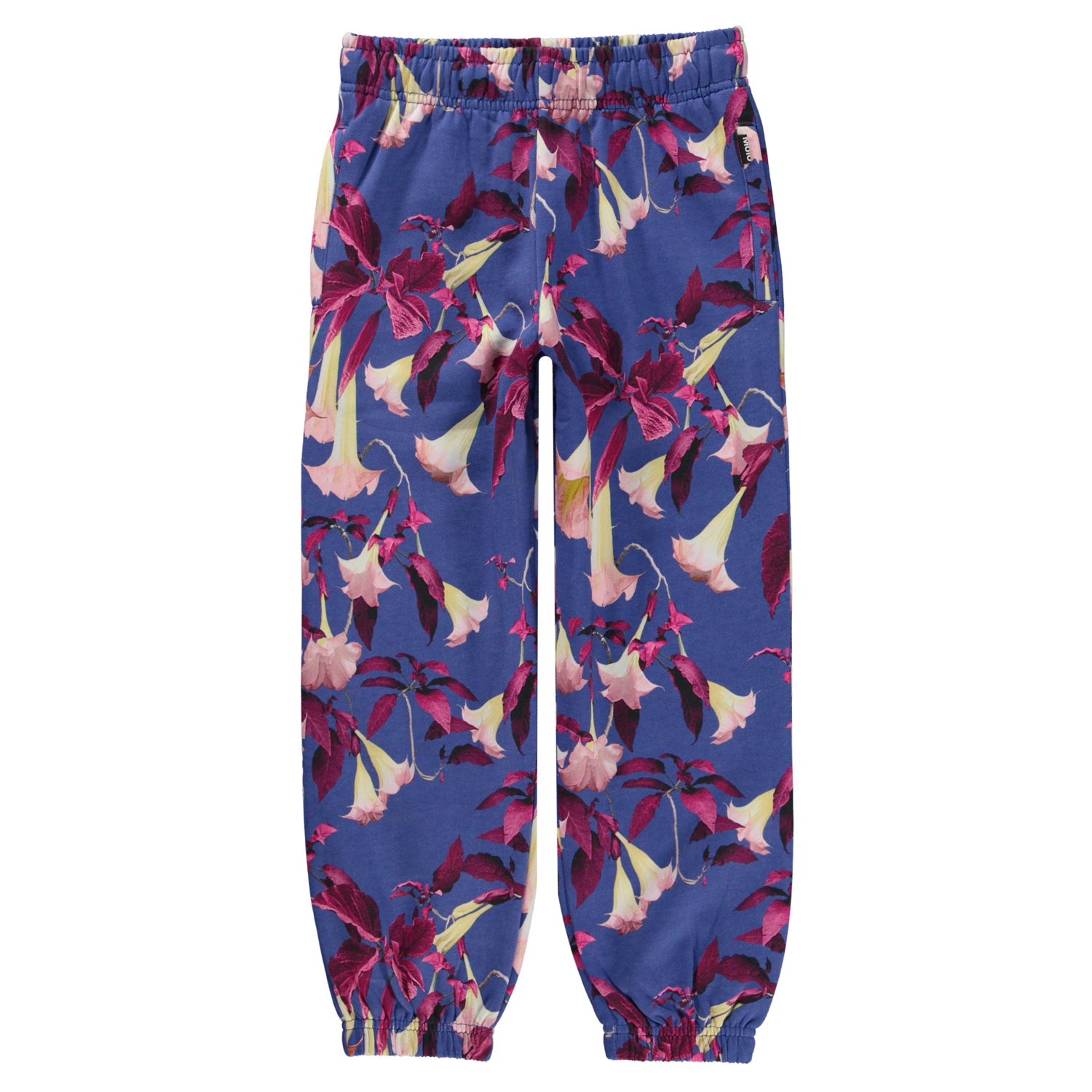 Blå sweatpants med allover lyserødt og pink blomsterprint. Printet har en klar blå baggrund, og er sammensat af pink efterårsblade og de natblomstrende, Engletrompeter. Særligt for Engletrompeten er at den ikke blomstrer om dagen, som andre blomster, men om natten. Her bader de i månens stråler og folder deres blade ud, alt imens vi andre sover. Disse sweatpants er fremstillet i 100% bomuld, har elastik og indvendigt bindebånd i taljen, lommer i siden, en baglomme, elastik ved fødderne, samt et regulært fit. Match evt. disse sweatpants med sweatshirten, Marge, i samme print, for et super cool sæt.