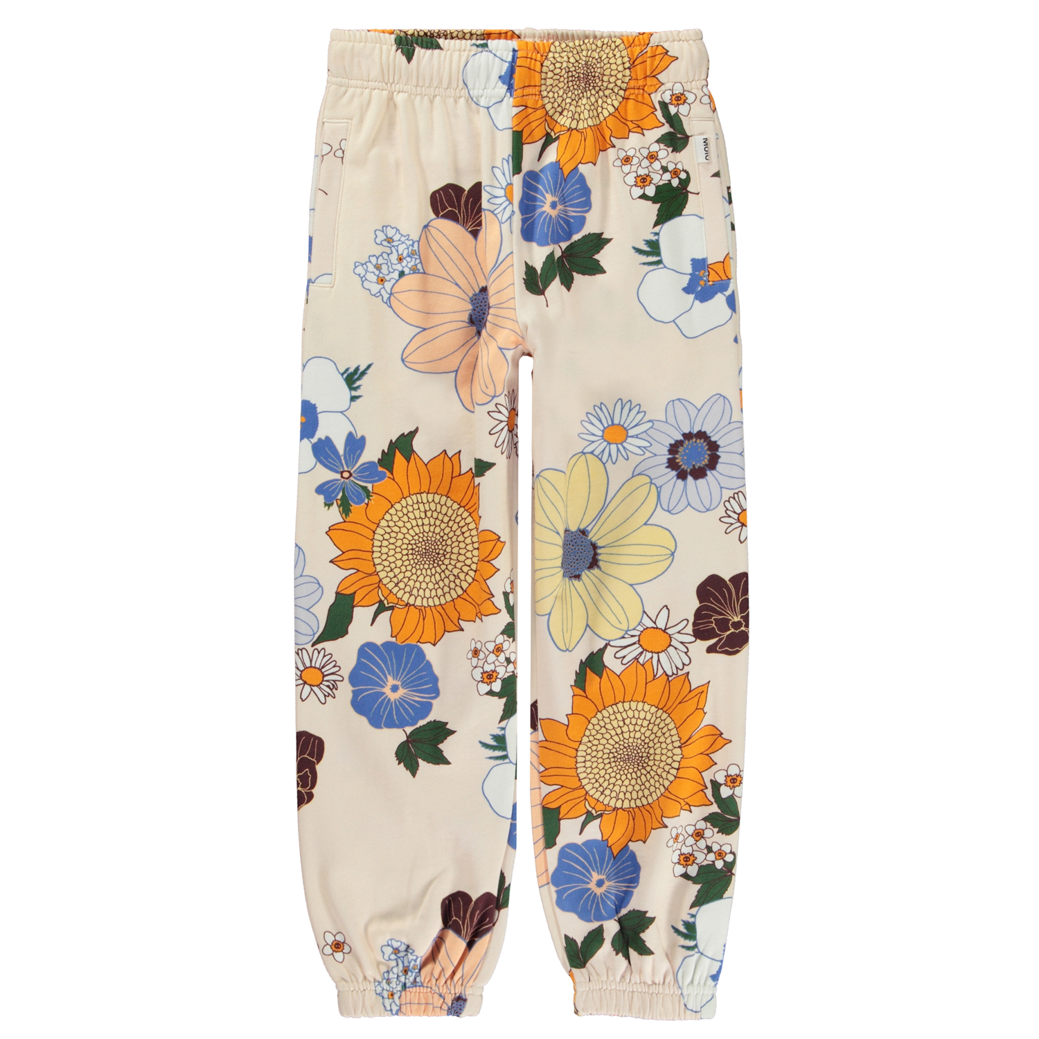 Råhvide sweatpants med allover blomsterprint. Et simpelt grafisk print tegnet i hånden. Printet består af en masse forskellige blomster, som fx solsikker og geoginer, i lyserøde og gule nuancer. Disse sweatpants er fremstillet i 100% bomuld, har elastik og indvendigt bindebånd i taljen, lommer i siden, en baglomme, elastik ved fødderne, samt et regulært fit. Match evt. disse sweatpants med sweatshirten, Maxime, i samme print, for et super cool sæt.