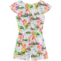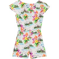 Lys shorts buksedragt i en økologisk bomulds jersey. Buksedragten er uden ærmer men har en bred krave der falder ned over skuldrene samt en elastik i taljen. Buksedragten har et alloverprint af øde øer, palmestrande og Hawaii blomster i friske farver