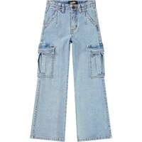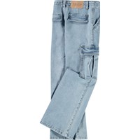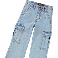 Blå denimjeans i økologisk bomuld. Disse jeans har en let trompetformet silhuet med for- og baglommer. Taljen har bæltestropper, knap- og lynlåslukning samt en indvendig justerbar elastik for en god pasform. Derudover har bukserne en cool detalje med store cargolommer midt på benene.