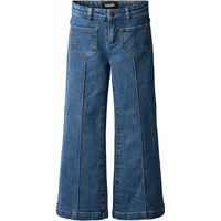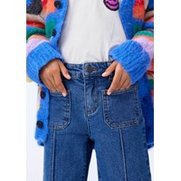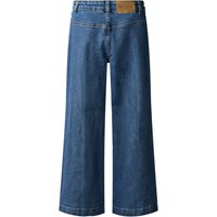 Denimblå 70''er jeans i økologisk bomuld med syet pressefold. Buksen har trykknap- og lynlåslukning, bæltestropper og en indvendig justerbar knap i taljen for en god pasform. Den har en trompetformet silhuet og påsyede lommer på fronten.