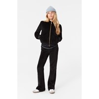 Sorte velourbukser i blød bomuld med trompetfacon. Bukserne har en bred elastik i taljen med en indvendig snøre, der gør dem nemme at tage på og behagelige at have på. Kombiner bukserne med en matchende cardigan for at få et blødt og sporty sæt.