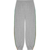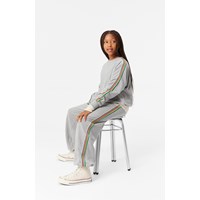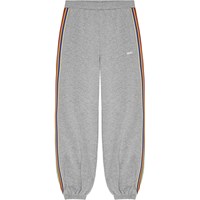 Grå jersey bukser i økologisk bomuld med en ubørstet inderside, der gør dem kølige på varme dage. Bukserne har normal pasform og elastik i taljen og buksebenet, hvilket gør dem nemme at tage på og behagelige at have på. Striberne langs siden hylder de olympiske lege og giver bukserne et sporty look. Kombiner dem med en matchende sweater for et komplet sæt.