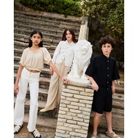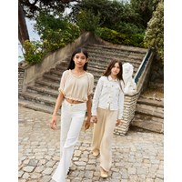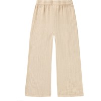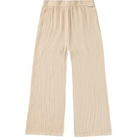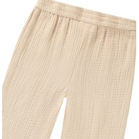 Sandfarvede bukser i creppet bomuld. Bukser har en løs pasform, elastisk talje samt brede ben.
