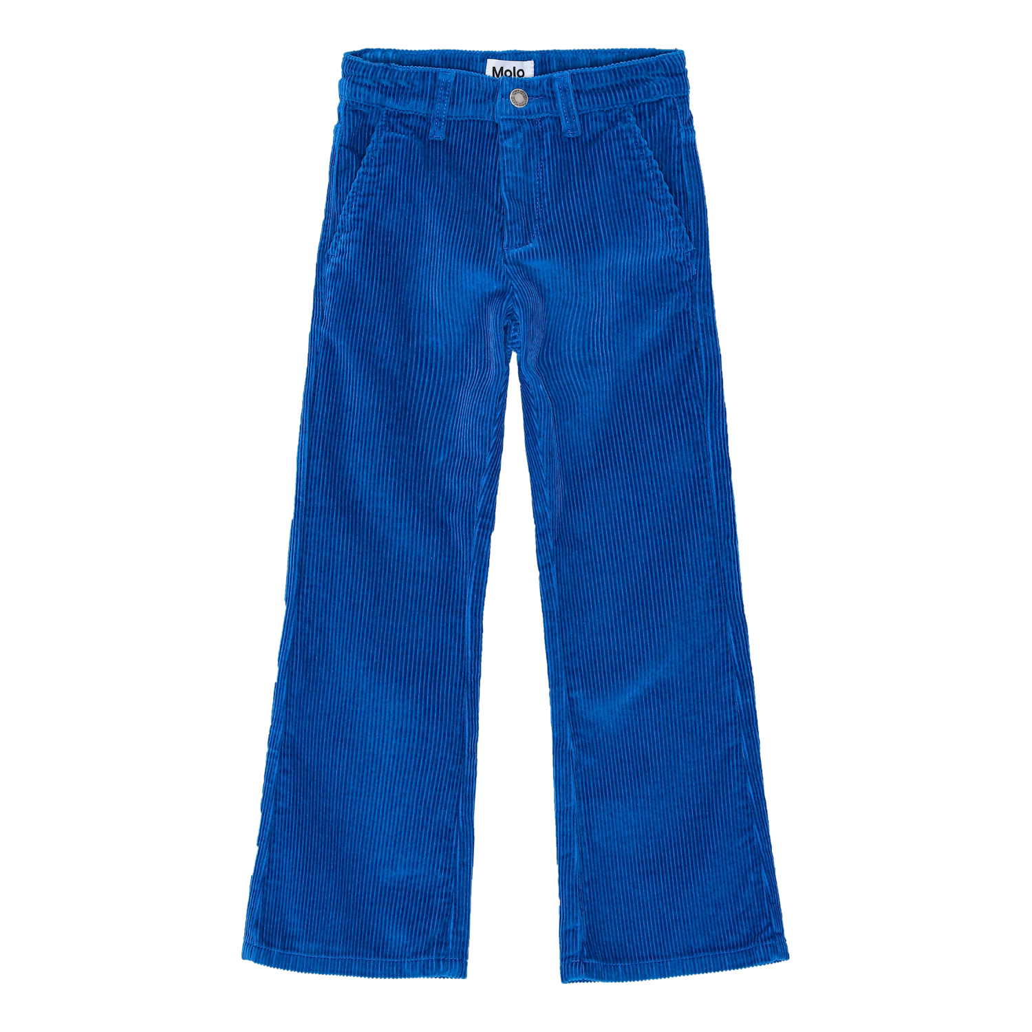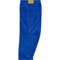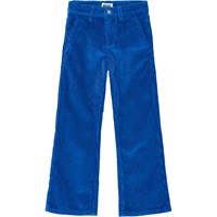 Blå bukser lavet af blød bomuldsfløjl med trompetformet silhuet. Bukserne har for- og baglommer samt knap- og lynlåslukning i taljen med indvendig justerbar elastik for god pasform.