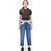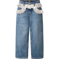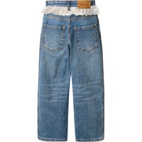 Blå jeans i økologisk bomuldsdenim med hvid blondedetalje. Jeansene har 5 lommer, lige ben, lynlåsgylp og løs pasform med justerbar elastik i taljen. Mindste størrelser (92–134) har trykknap, mens str. 140–176 har klassisk jeansknap.